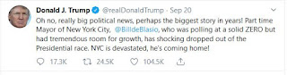 “Oh no, really big political news, perhaps the biggest story in years! Part time Mayor of New York City,@BilldeBlasio, who was polling at a solid ZERO but had tremendous room for growth, has shocking dropped out of the Presidential race. NYC is devastated, he’s coming home!”