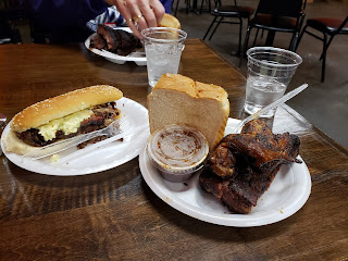 Once we walked inside and started talking to everyone in line everyone was really friendly and helpful in telling us what to order and what their specialties and favorites are. I ordered a beef brisket sandwich and a combo platter of ribs and smoked wings. It came with bread and baked beans on the side.