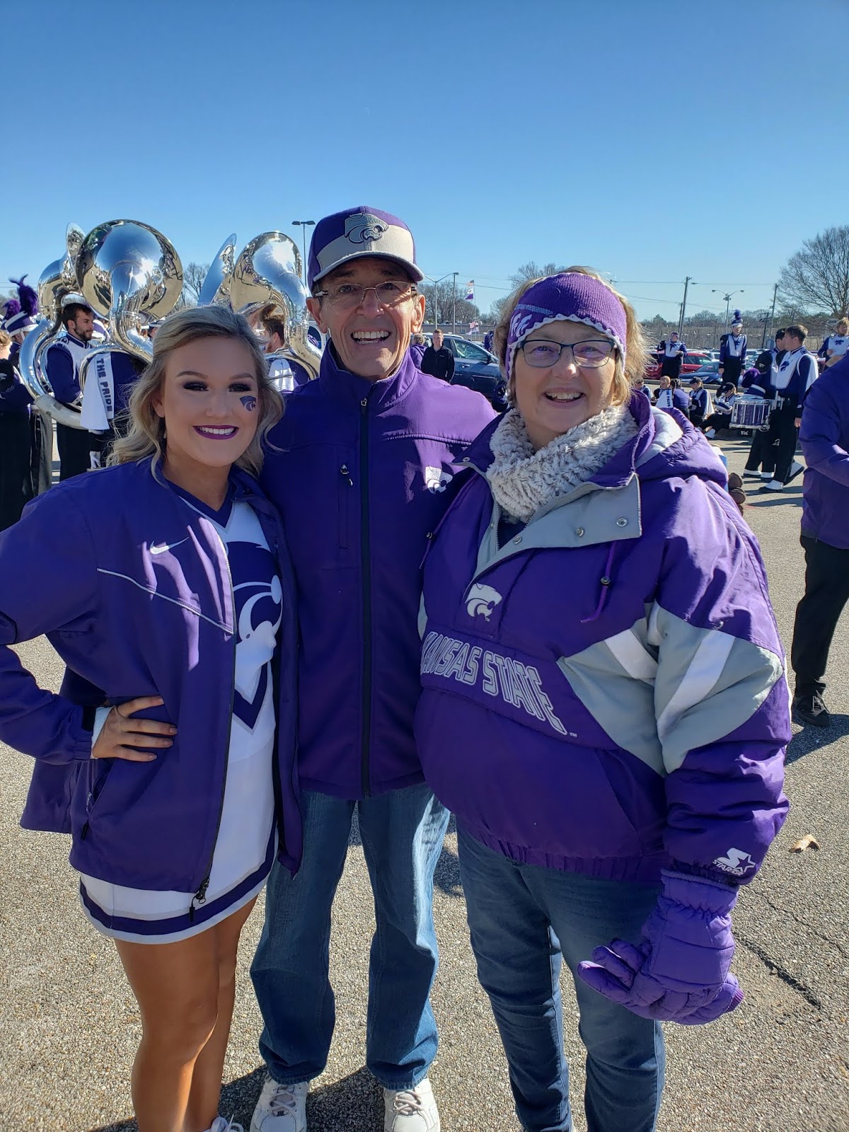 The K-State band was warming up near us, so we walked over to listen and take some pictures and video. My Mom’s cousin’s daughter Reagan is a K-State cheerleader so my Mom tried to find her by walking on the various buses until she found her. We chatted with with Reagan for a bit and got a couple pictures.